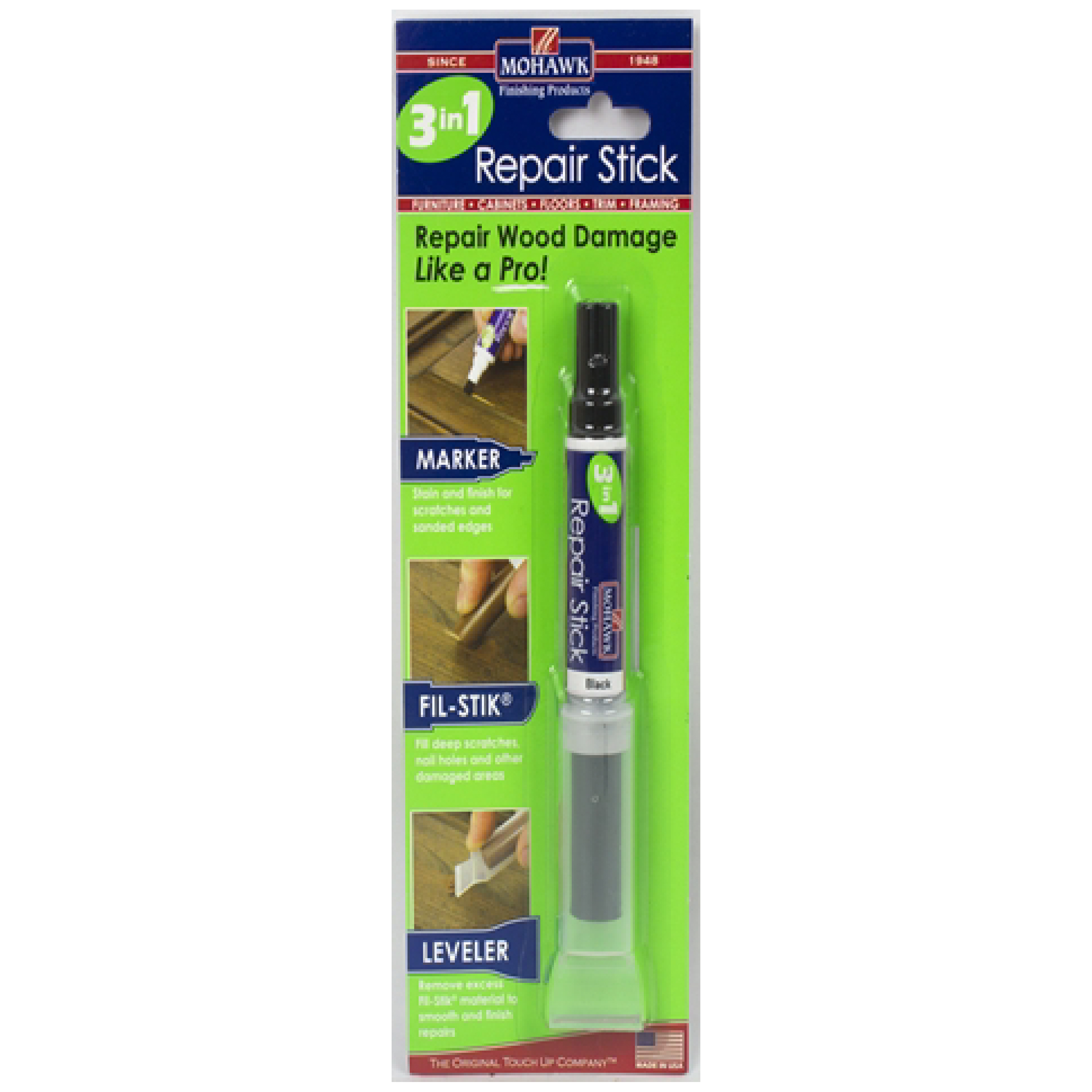 The 3-in-1 Repair Stick is a quick and simple way to repair scratches, nicks, dents or other minor imperfections in any wood surface. It is ideal for touching up furniture, cabinets, trim, doors and even wood floors. Used together or individually, this 3-in-1 Repair Stick provides you with the three essentials needed for the most common wood touch-ups and repairs. Quickly fill deep scratches, nail holes and other damaged areas in low traffic areas using the Fil-Stik®. Push the Leveller Cap across the filled surface to clean and smooth your repair area. Replace colour on furniture edges and scratches using the wood stain Mohawk Marker.