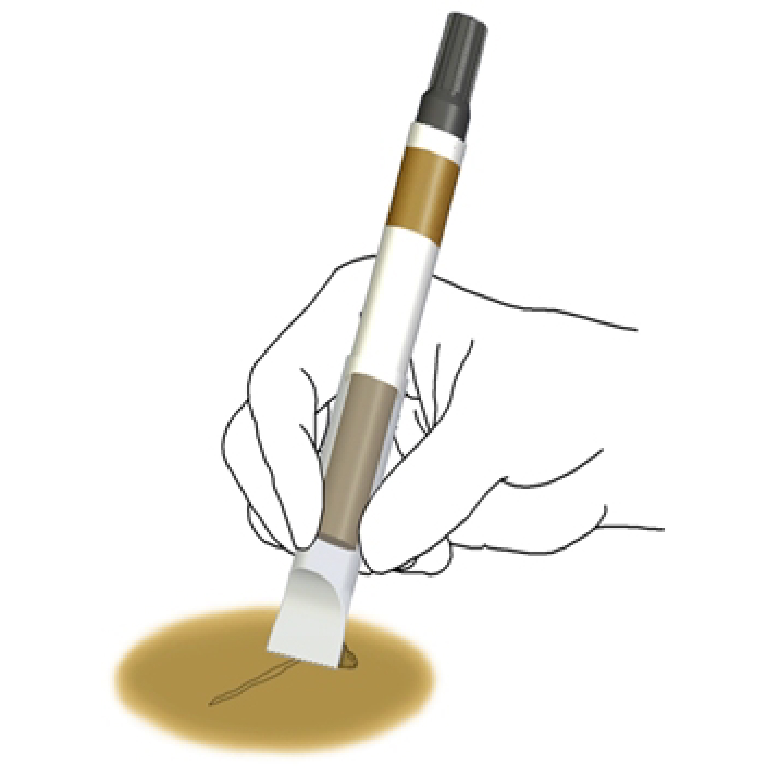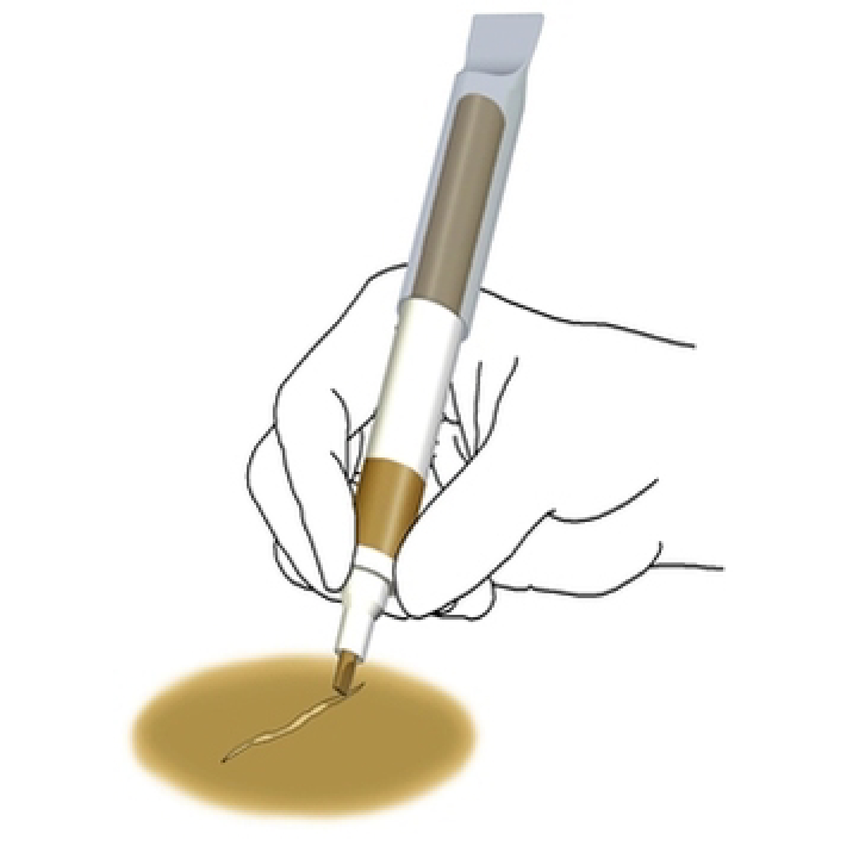 STEP 2: Remove the cap and depress the nib in an upright position to relieve pressure. To start paint flow, press the tip onto a rag until wet.